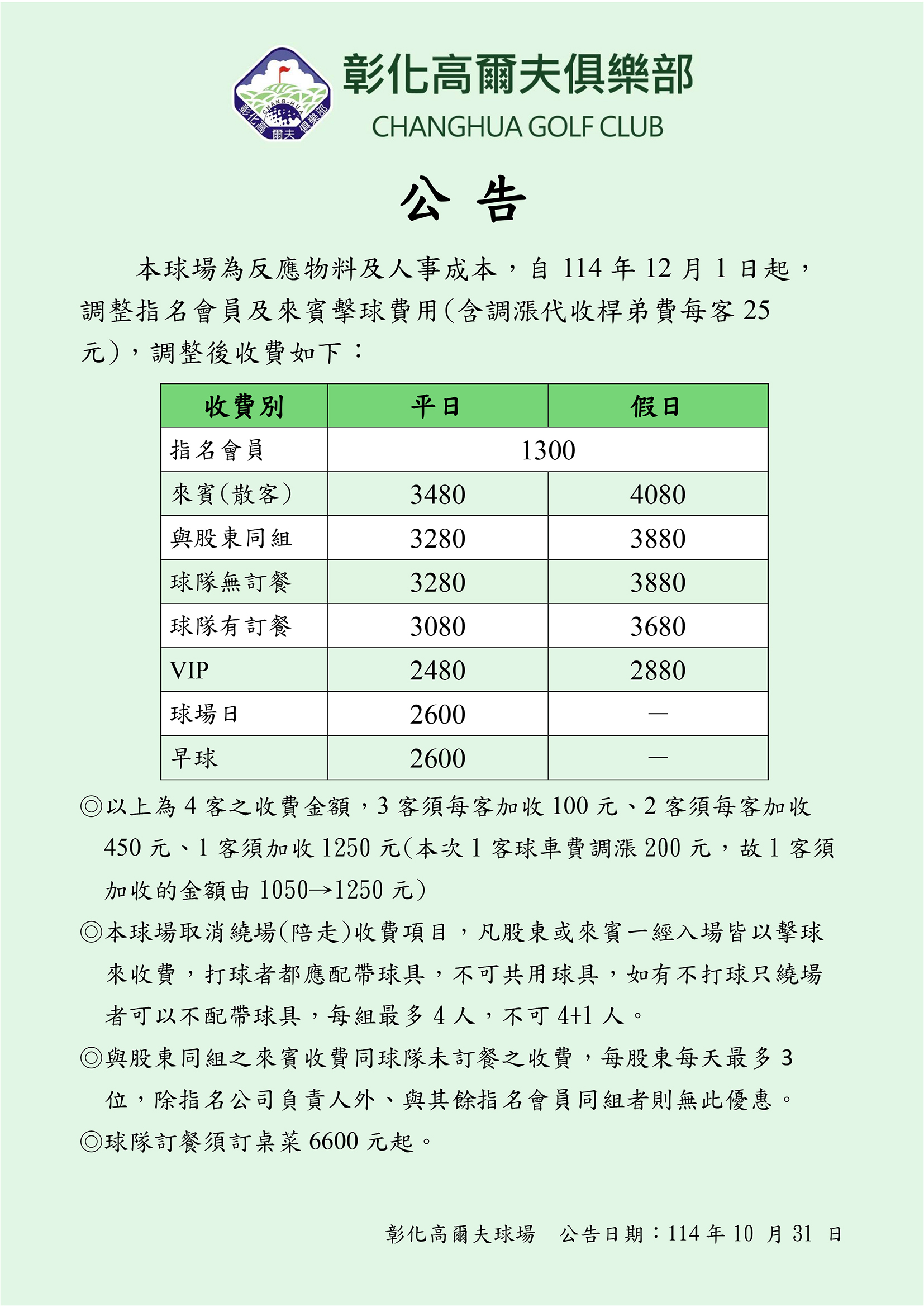 本球場擊球費用調漲公告